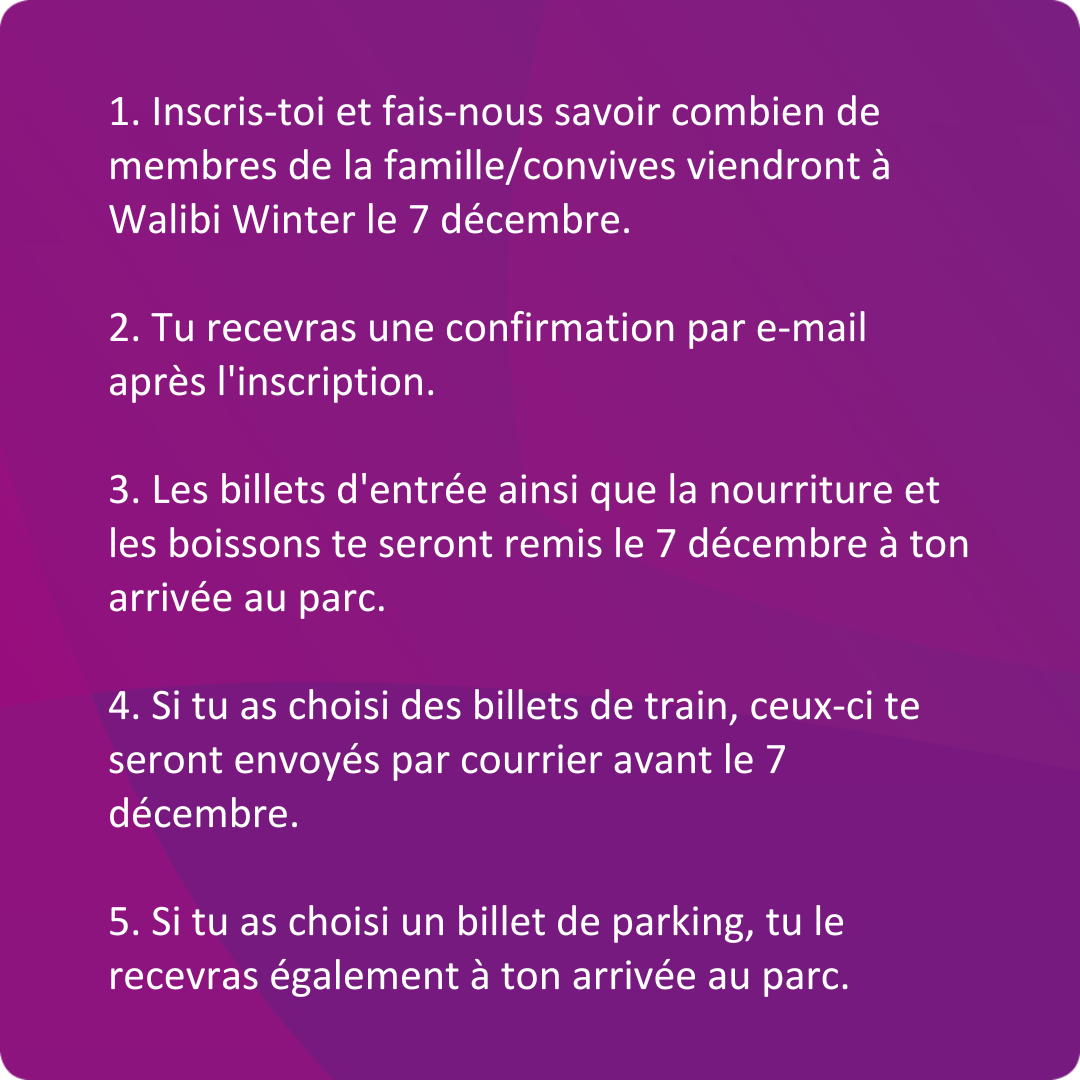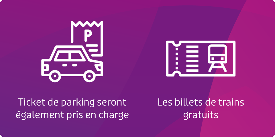 Deux possibilités s'offrent à vous. Des billets de train (aller-retour) de n'importe quelle gare pour chaque invité. Ou un ticket de parking pour une voiture.